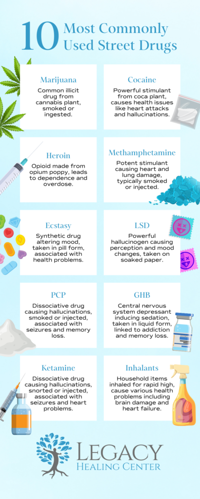 As an addiction treatment provider, the team at Legacy Healing Center understands the impact that drug addiction can have on an individual’s life. Education and awareness are important tools in helping people overcome addiction, which is why we have put together a list of the top 10 most common street drugs.